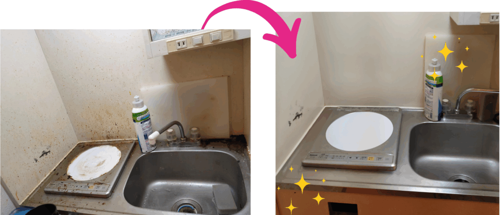 | 【清掃箇所】 トイレ・洗面所・浴室・キッチン・換気扇・エアコン(簡易清掃)・玄関・窓・網戸・サッシ・床・扉・収納・ベランダ など |